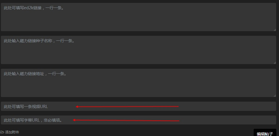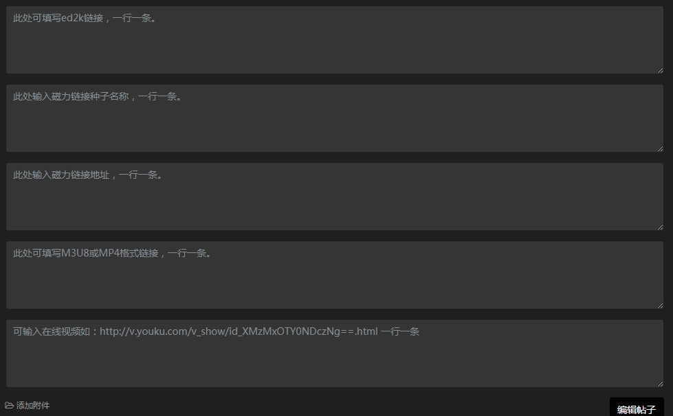 前面三项为电驴链接、磁力链接名称、磁力链接地址、都是每行一条以回车换行即可。