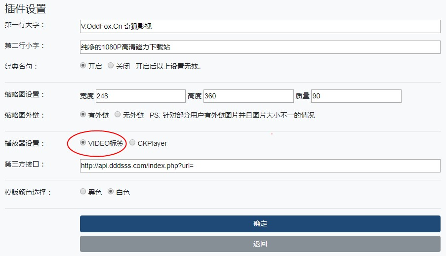 第四项为流媒体视频地址,可填写的格式为M3U8或MP4链接地址,一行一个;此处填写的地址会以CKPlayer播放器播放。
