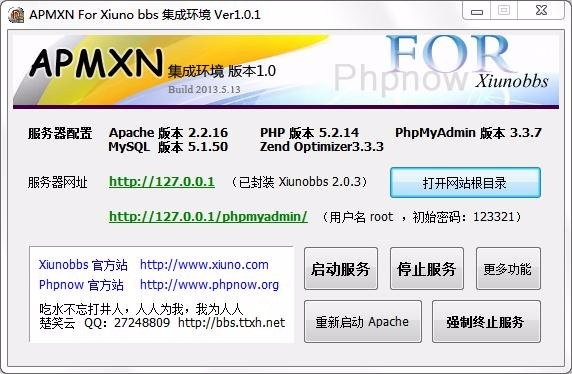 本程序以PHPNOW1.56 + Xiubbs2.0.3 为基础进行融合,解压即可使用!