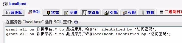 5、Mysql默认是关闭远程数据库访问功能的,如果要开启,请于phpmyadmin中运行如下代码